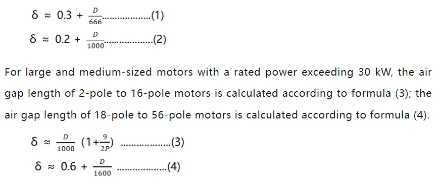 For small-sized motors with a rated power not exceeding 30 kW, the air gap length of a 2-pole motor is calculated according to formula (1), and the air gap length of a 4-pole and 12-pole motor is calculated according to formula (2).